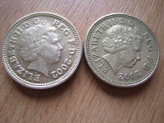 Supposedly 2% of all pound coins are counterfeit. But how do you know when you have a fake? I heard the news item and had a quick look at the pound coins in my pocket, and couldn’t see anything. I thought that maybe it wasn’t all that easy to spot. But then I saw one my Mum had: