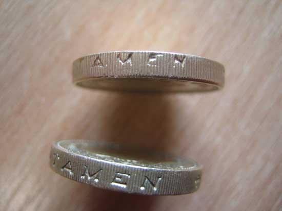 One thing that doesn’t prove it’s fake, however, is the orientation of the lettering on the side. All my pound coins (except the fake) have the obverse facing upwards when reading the lettering, but I’ve seen other coins where it’s the other way around. There’s a three-part post over at Blogalism that goes into more detail, and in one of the comments explains that the coins fall from the face-stamping machine into the edge-inscription machine, giving it a 50% chance of appearing either way up.