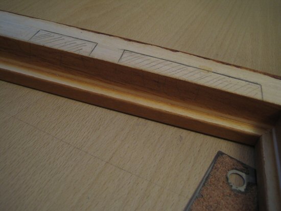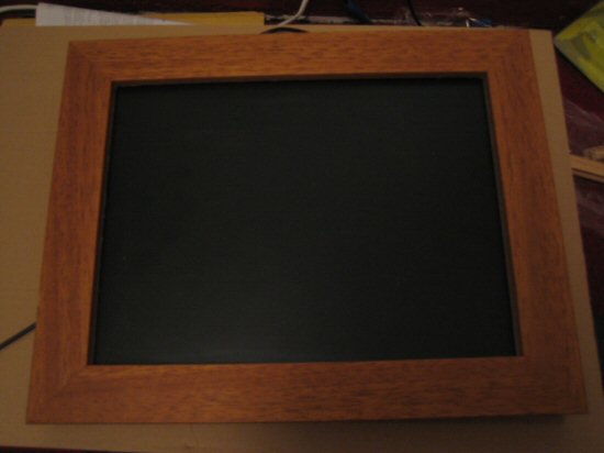 The frame required a bit of cutting to get the laptop to fit in — the biggest problem was the wireless PCMCIA card sticking out from the side of the motherboard, but a little cutting into the (thankfully soft) frame and it fitted. However the bit stuck out from the back of the frame about 8mm — a couple of lengths of wood sorted this out. I applied a couple of coats of wood stain to the spacers to match the frame colour.