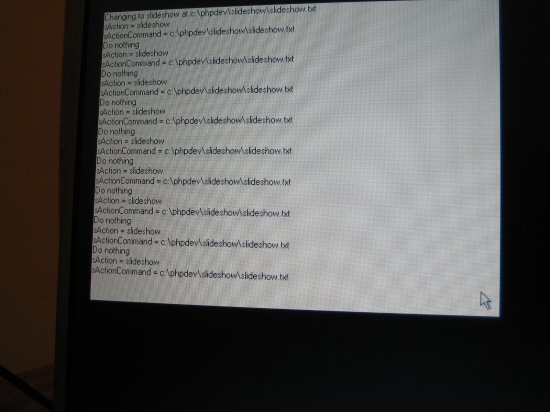 I wanted the picture frame to show pictures from a specific network location if it was available — my parents have a network drive with all their pictures on it — so I messed around with showing pictures in a Flash slideshow that I’d made for our Media Center screensaver. The RAM stick reared its ugly head again; the cross fade in the slideshow was very jerky, so the Flash idea was ditched.